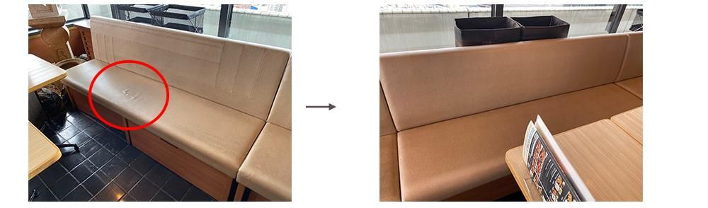 座面の中央に大きな裂け目。テープで補強しだましだまし使用されていましたが、だんだん大きくなってきたため張替えをご依頼いただきました。 大きなベンチ椅子ですが、背もたれと座面を合わせてリニューアル!お客様にもご好評のようです! 大阪市内レストラン様 |
